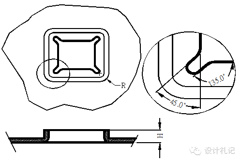 方形抽孔,當(dāng)抽孔高度較高時(shí)(H>Hmax),直邊部展開與彎曲一致, 圓角處展開按保留抽高為H=Hmax的大小套彎曲公式展開,連接處用45度線及圓角均勻過渡, 當(dāng)抽孔高度不高時(shí)(HHmax)直邊部展開與彎曲一致,圓角處展開保留與直邊一樣的偏移值.
