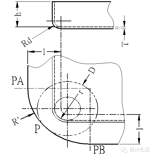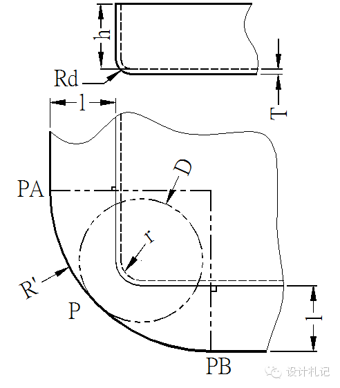 原則:直邊部分按彎曲展開,圓角部分按拉伸展開,然后用三點(diǎn)切圓(PA-P-PB)的方式作一段與兩直邊和直徑為D的圓相切的圓弧.